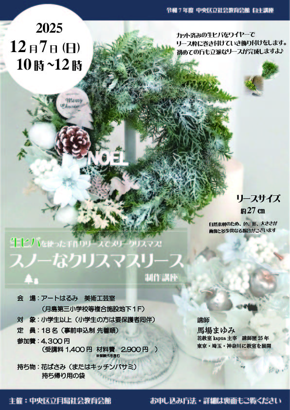 ホーム > 講座情報 > 生ヒバを使った手作りリースでメリークリスマス! スノーなクリスマスリース  制作講座