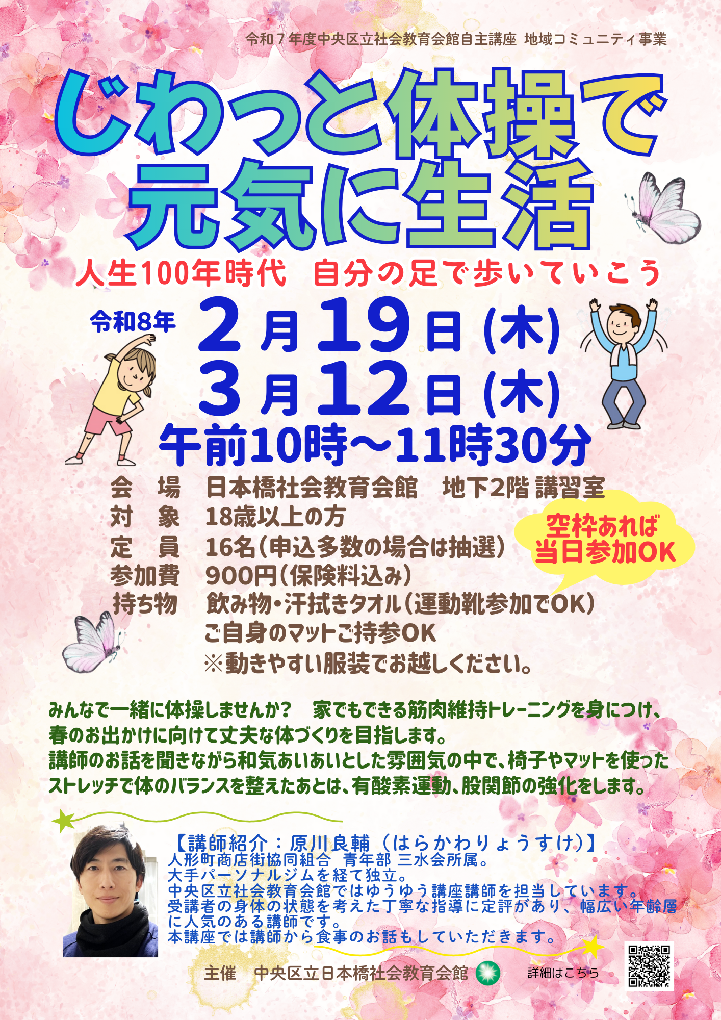 人形町商店街協同組合青年部三水会所属。 大手パーソナルジムを経て独立。ゆうゆう講座も担当中。 受講者の身体の状態を考えた丁寧な指導に定評があり、幅広い年齢層に人気があります。