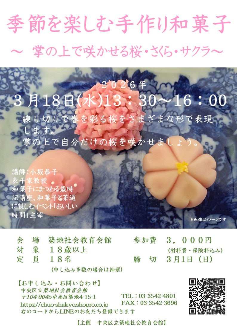 ◆お申し込み方法◆ 築地社会教育会館窓口、またはお電話(03-3542-4801)、FAX(03-3542-3696)にてお申込ください。 ※日本橋・月島・アートはるみの各社会教育会館窓口でもお申し込みいただけます。 【主催】 中央区立築地社会教育会館
