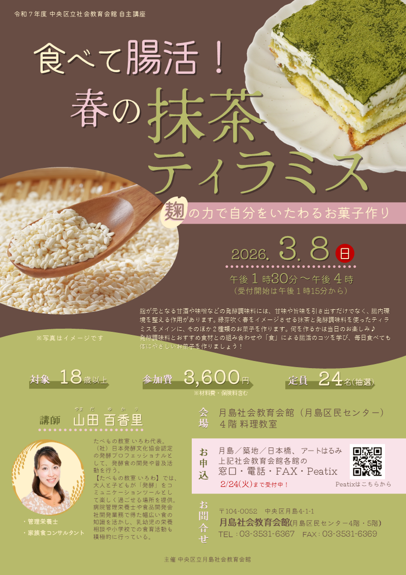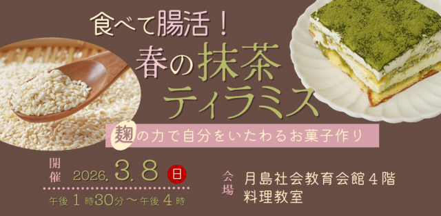 麹が元となる甘酒や味噌などの発酵調味料には、甘味や旨味を引き出すだけでなく腸内環境を整える作用があります。緑芽吹く春をイメージさせる抹茶と発酵調味料を使ったティラミスをメインに、そのほか2種類のお菓子を作ります。何を作るかは当日のお楽しみ♪