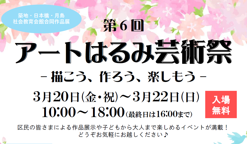 | 月島社会教育会館(担当:川原) | 〒104-0052中央区月島4-1-1 TEL・FAX:03-3531-9190(アートはるみ) |