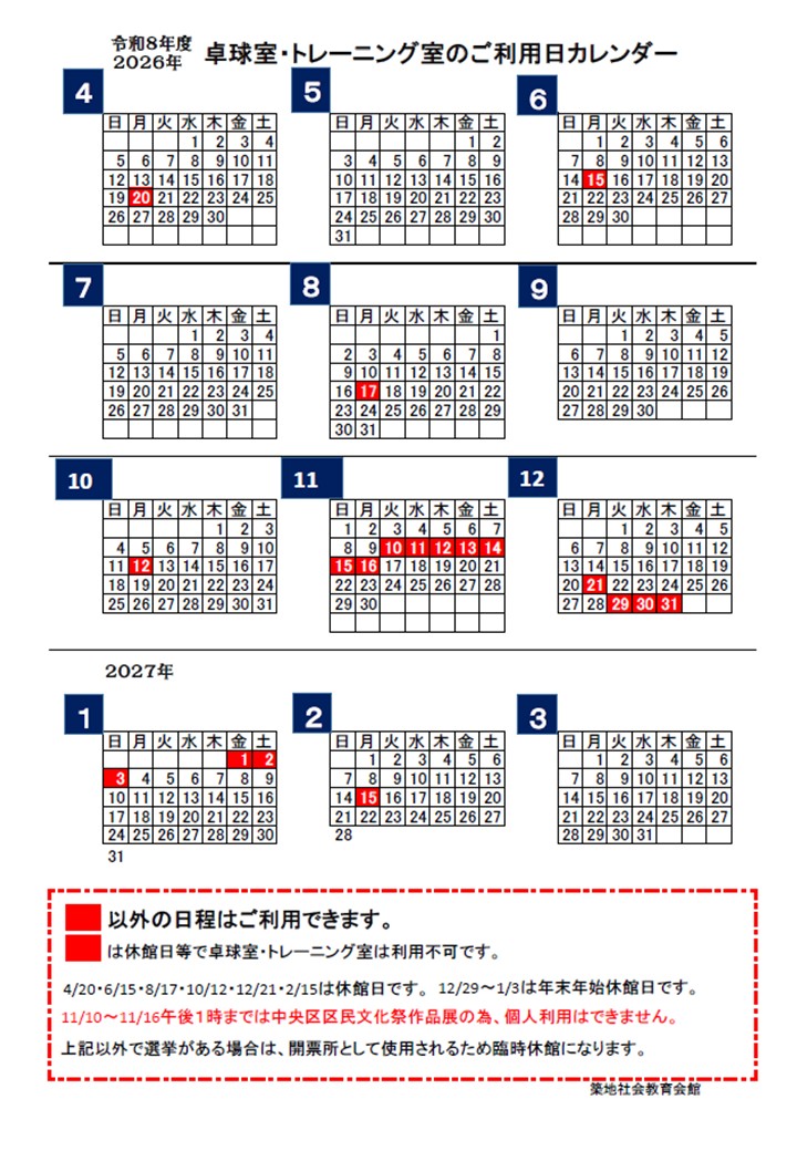 2026年4月~2027年3月の卓球室・トレーニング室のご利用日は下記の通りです。
